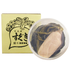 京都上賀茂産の「すぐき」を塩だけで漬け上げ、 室(むろ)と呼ばれる温室で乳酸発酵させた「丸すぐき漬け」です。